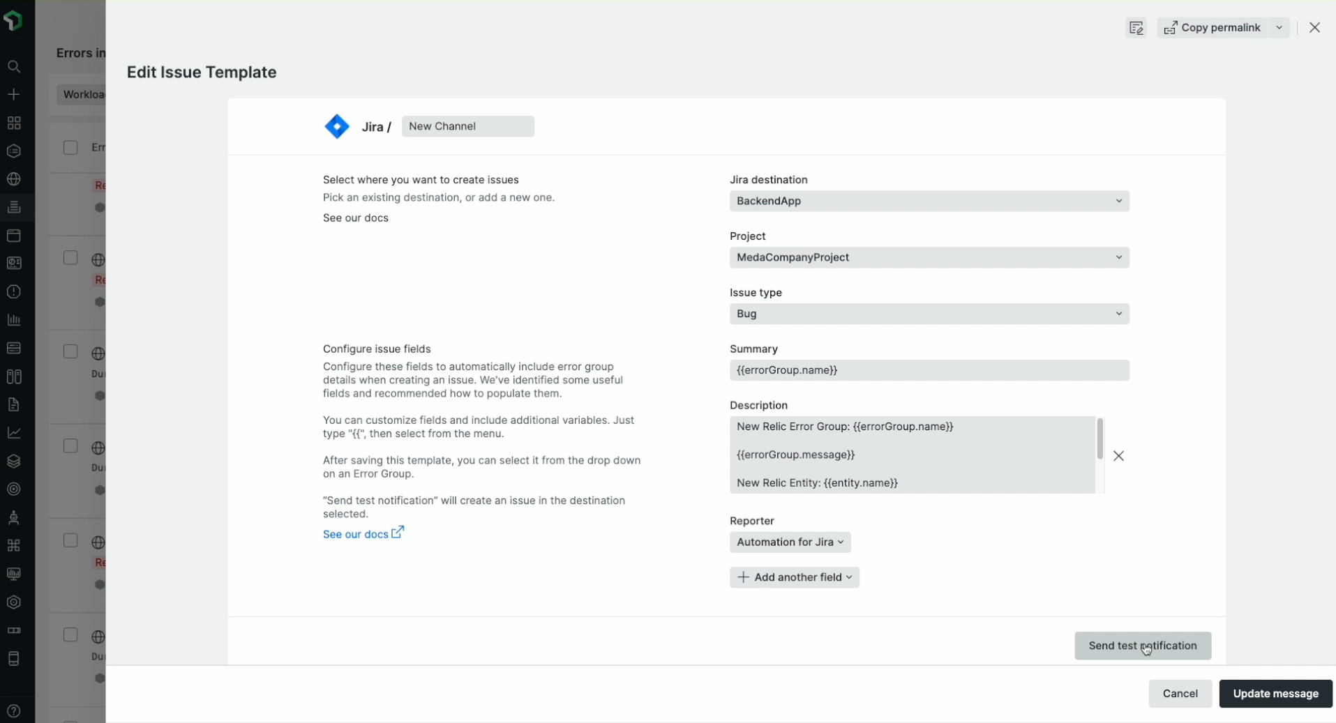- Click "Send test notification" to preview what the ticket looks like in Jira. Once you’re satisfied, click "Update message" to save the template. Note that a test notification will create a Jira ticket in your Jira Workspace.