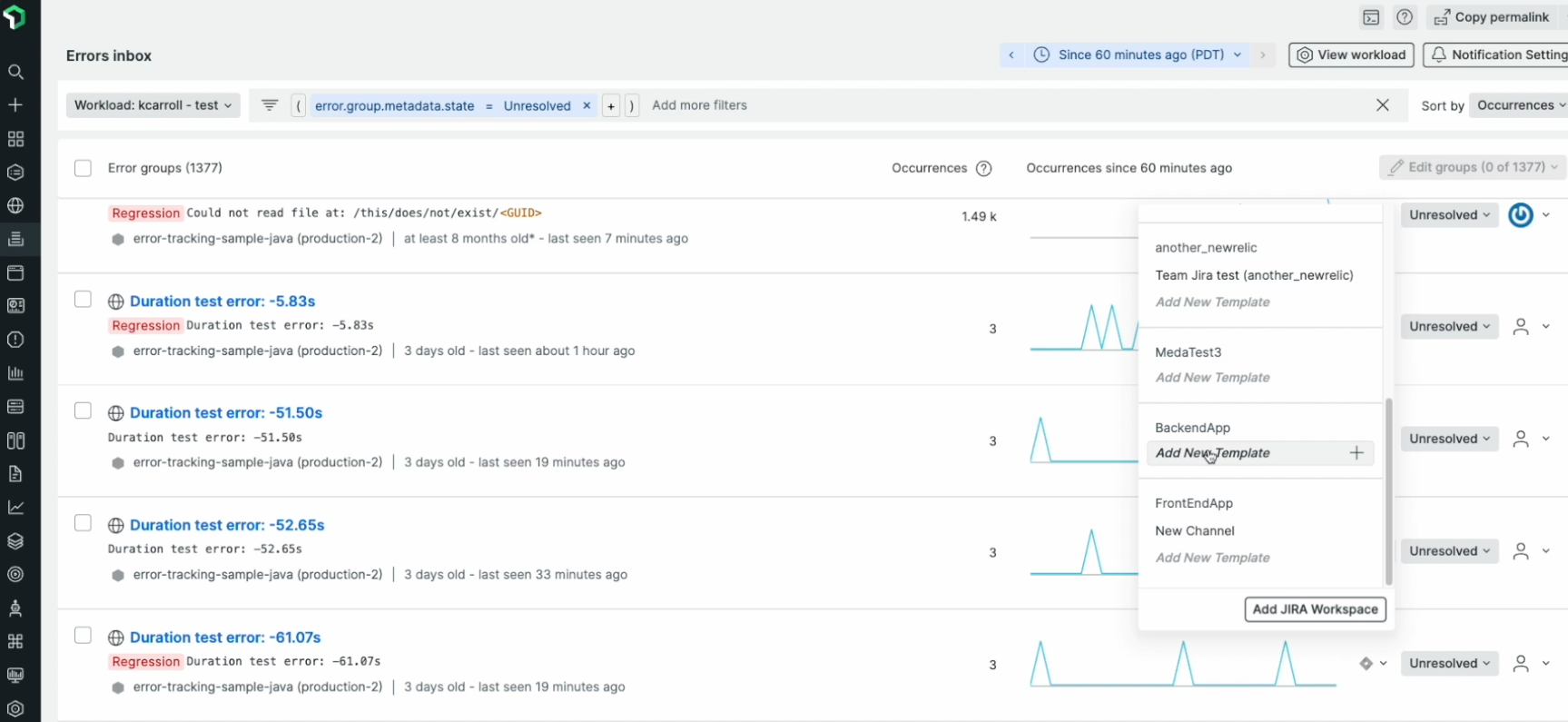 - Next, set up a template. Templates determine what information will be sent to Jira. In errors inbox, click the Jira icon next to an error group to see the Jira destination you created, then click the "Add New Template" link in the Jira destination.