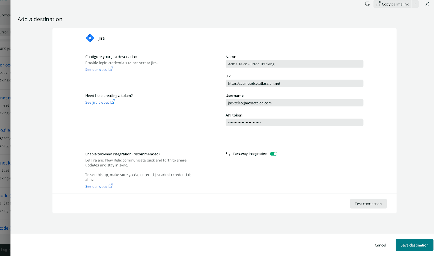 - You need to add the following details to set up the Jira Workspace: (a) Name of the destination: A descriptive name to easily identify the workspace. (b) URL: The URL to the specific Jira environment. (c) Username: Your Jira username. (d) API Token: Your generated Jira API Token. Follow the link on the left if you need help creating one. (e) Two-way integration: Toggle on if you want New Relic and Jira to share information. Then, click Test connection before saving to ensure that your details are correct.