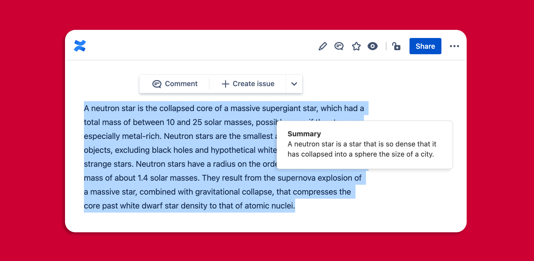 Directly inline with your highlighted text, the AI will quickly return a text summary. Works for any text, anywhere across your Confluence instance.