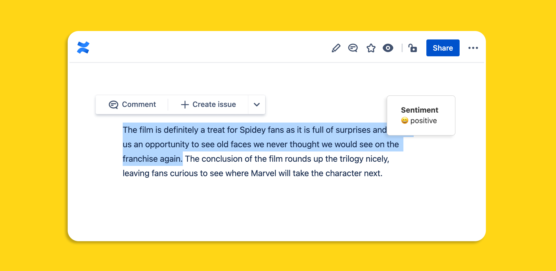 Directly inline with your highlighted text, the AI will quickly return the positive, negative or neutral sentiment. Works for any text, anywhere across your Confluence instance.