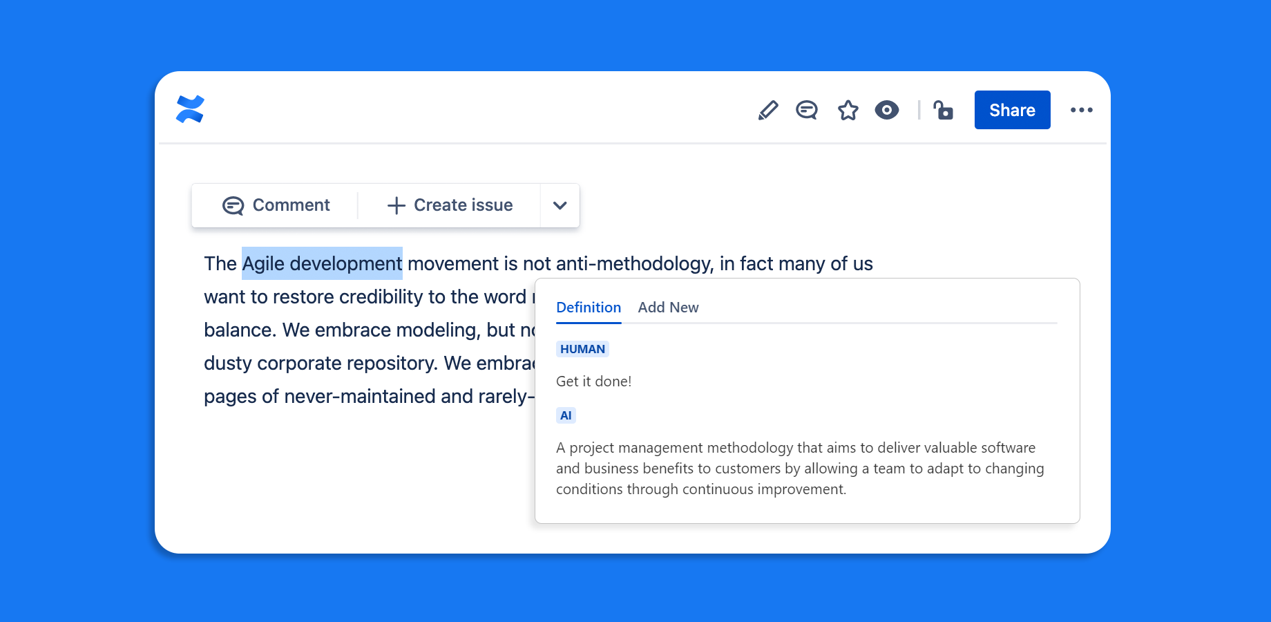 Directly inline with your highlighted text, the AI will quickly return the definition and meaning. Works for any word, anywhere across your Confluence instance.