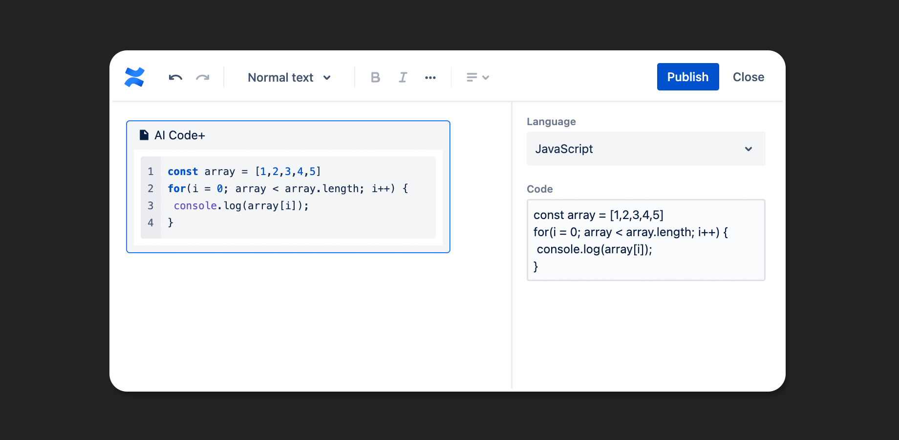 Simply type what code you want, and watch as the world's most advanced AI language model brings it to life inside your Confluence page.