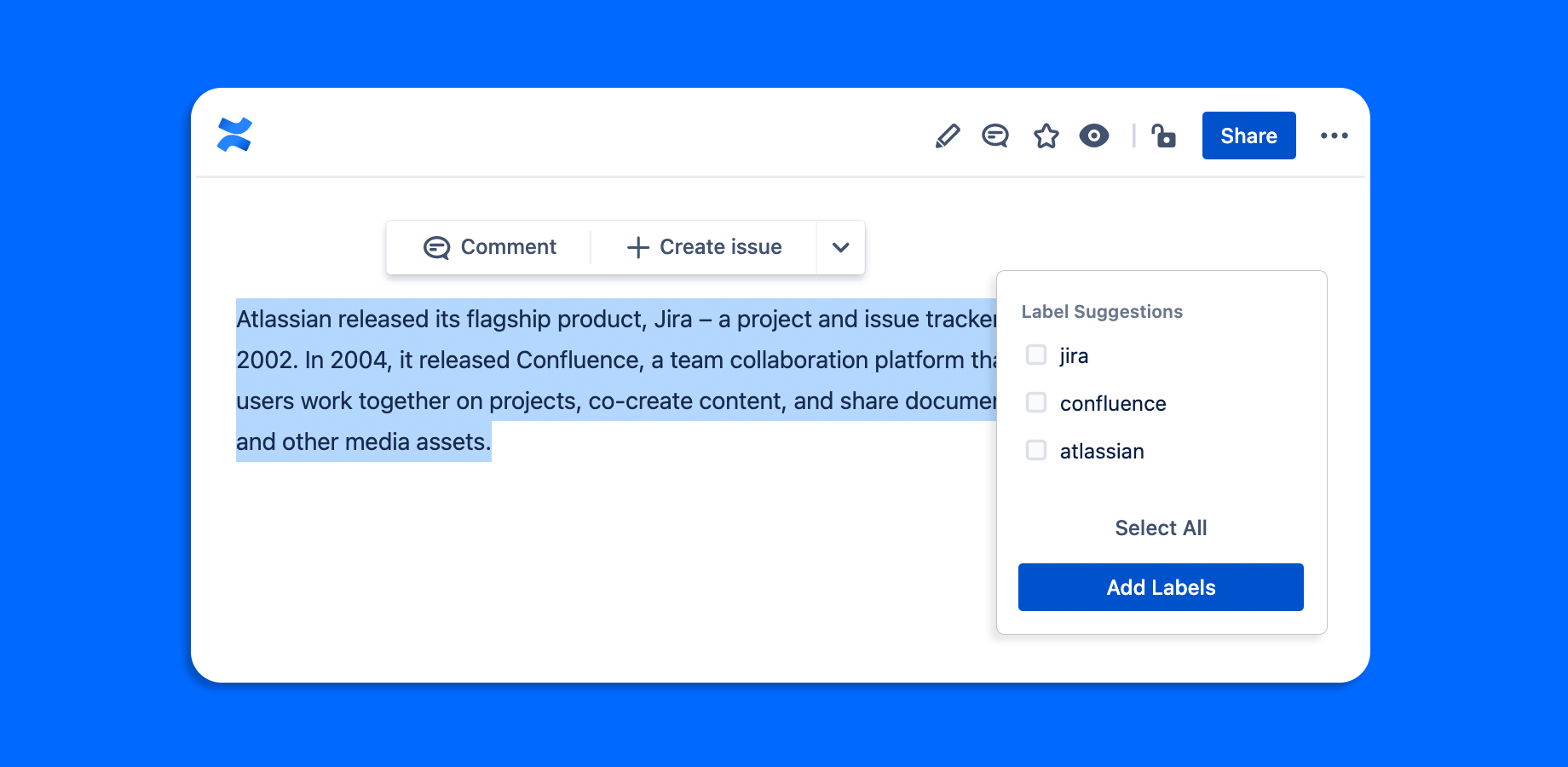 Directly inline with your highlighted text, the AI will quickly return a list of label suggestions. Select some and add them. Works for any text, anywhere across your Confluence instance.