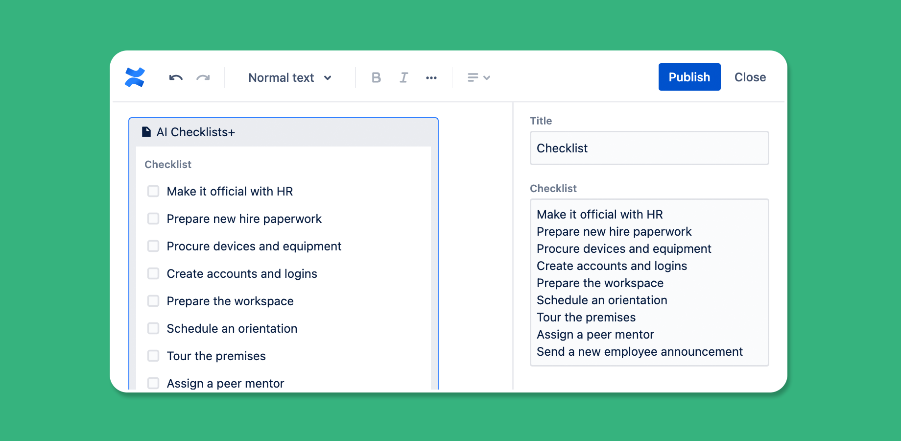 Simply type what todos or checklist you want, and watch as the world's most advanced AI language model brings them to life inside your Confluence page.