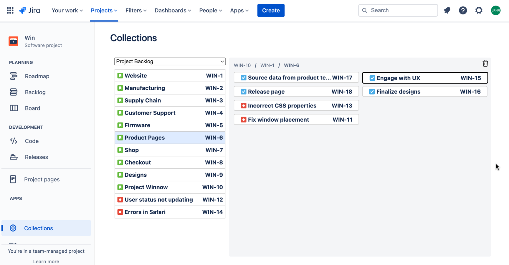 Move beyond JIRA’s limited Epic->Story->Task data model and create unlimited hierarchies of issues. This allows you to model real world situations and design proper work breakdown structures.
