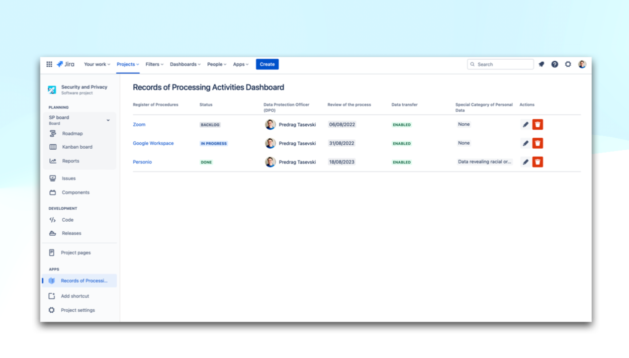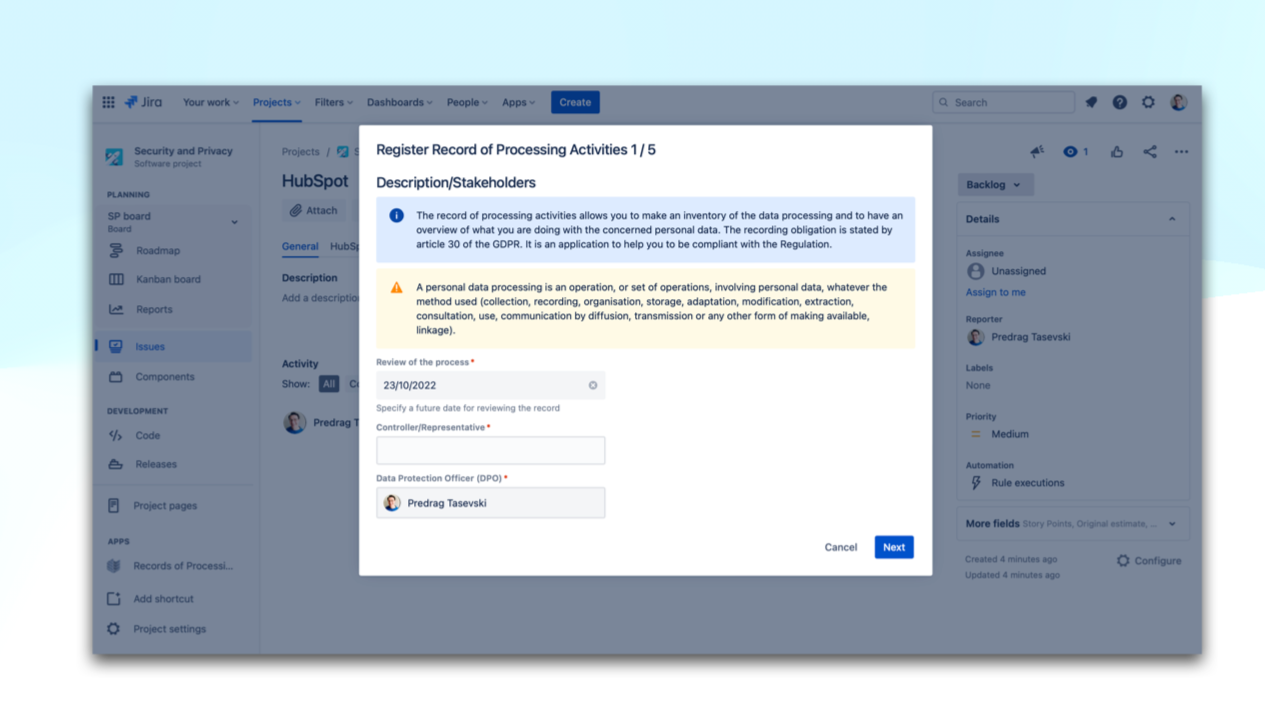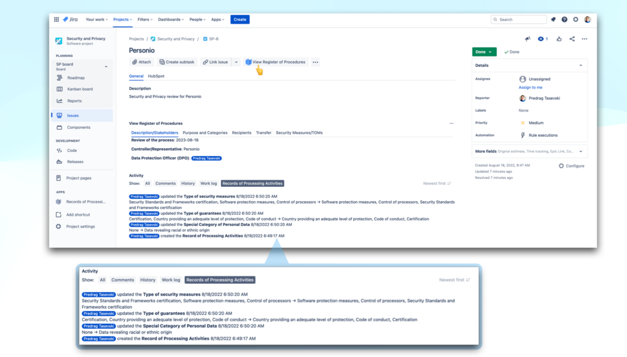 Key highlights of the appRecord of Processing Activities app for data, privacy and security compliance into Jira