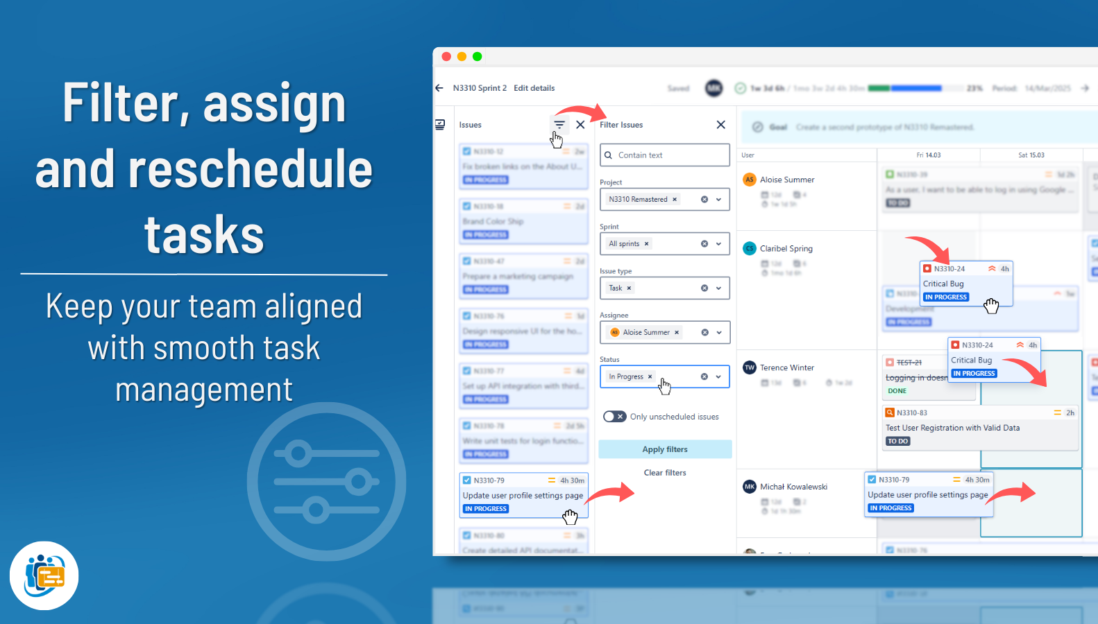 Filter your work items easily. Reassign, reschedule and adjust your plan effortlessly by dragging, dropping, and stretching the tasks. Engage the entire team in modifying and shaping your plan for maximum accuracy.