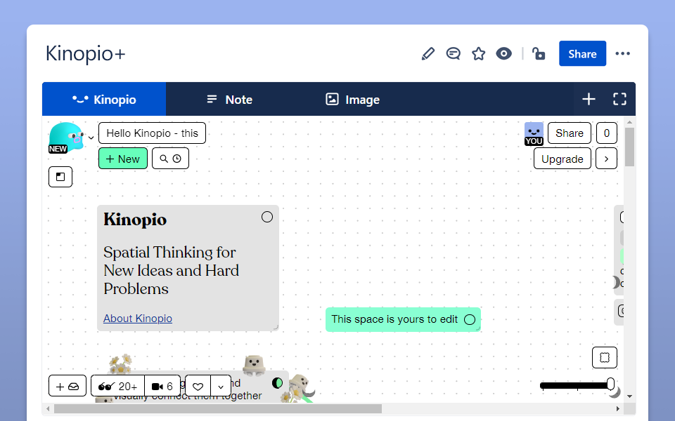 Kinopio+ for Confluence is the best way to seamlessly integrate Kinopio spaces into your Confluence content. Embed shared links by themselves or add multiple tabs with notes, images, PDFs, whiteboards and 150+ other compatible apps.