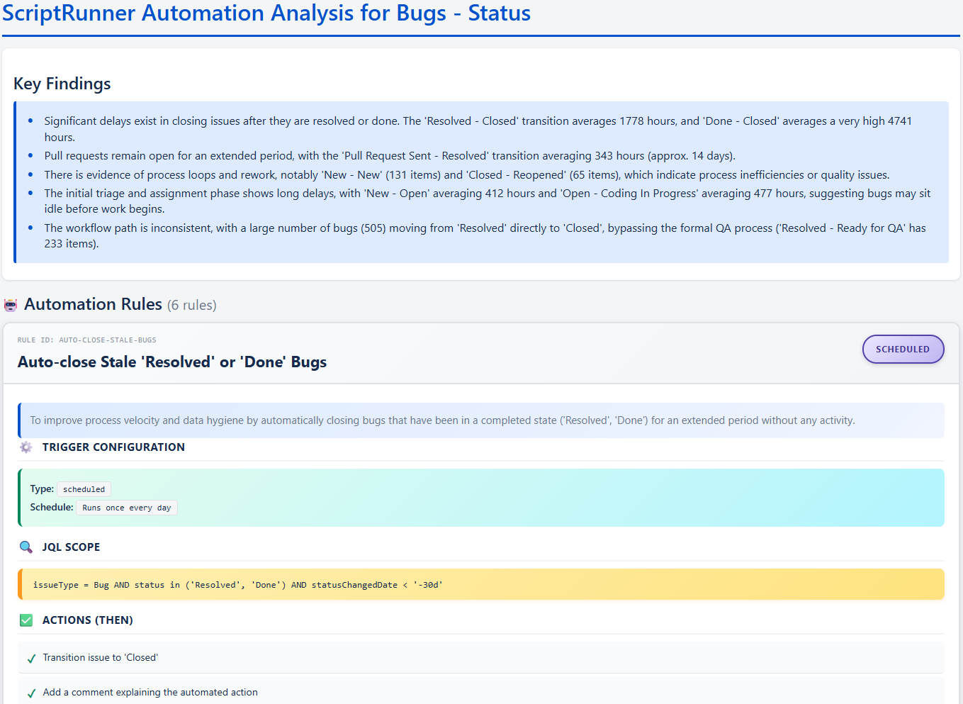 Turn insights into action. Instantly generate ready-to-use automation packs for Jira Automation, ScriptRunner, JMWE, or JWT—reducing manual work and delivering measurable ROI.