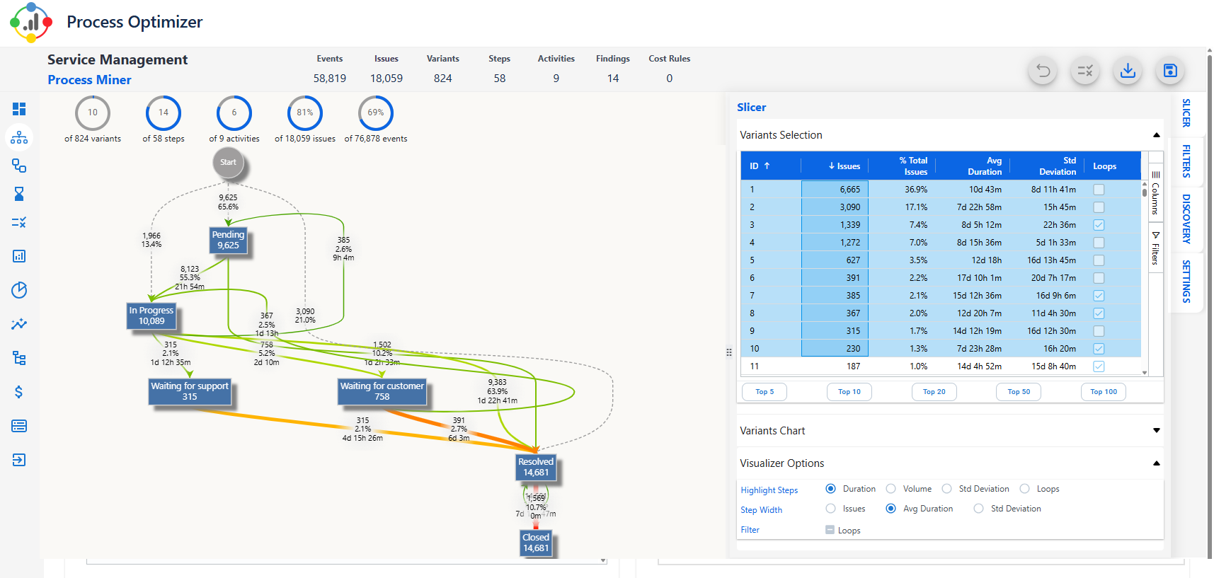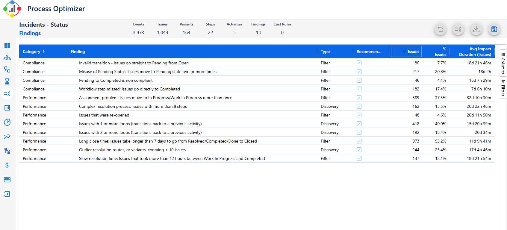 Pre-built best practice findings along with discovery algorithms to show you where the problems are in your workflows and processes. Recommendations are then available on how to fix the identified problems