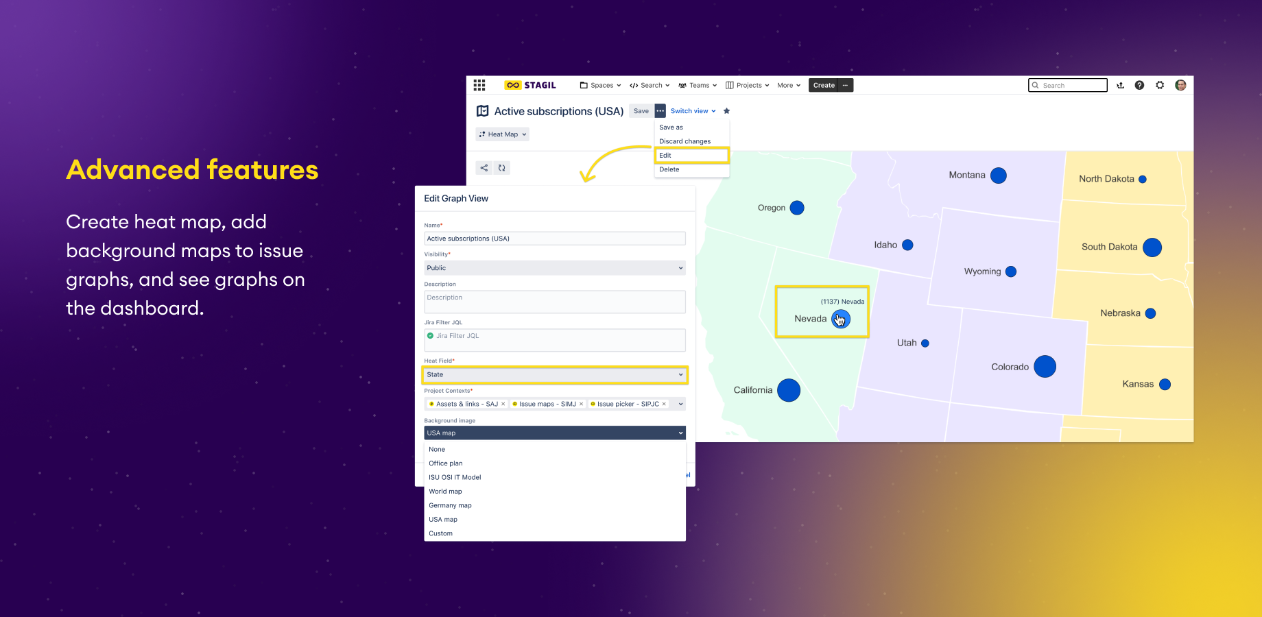Create heat maps based on custom fields, add background images to issue maps, and see graphs on the dashboard