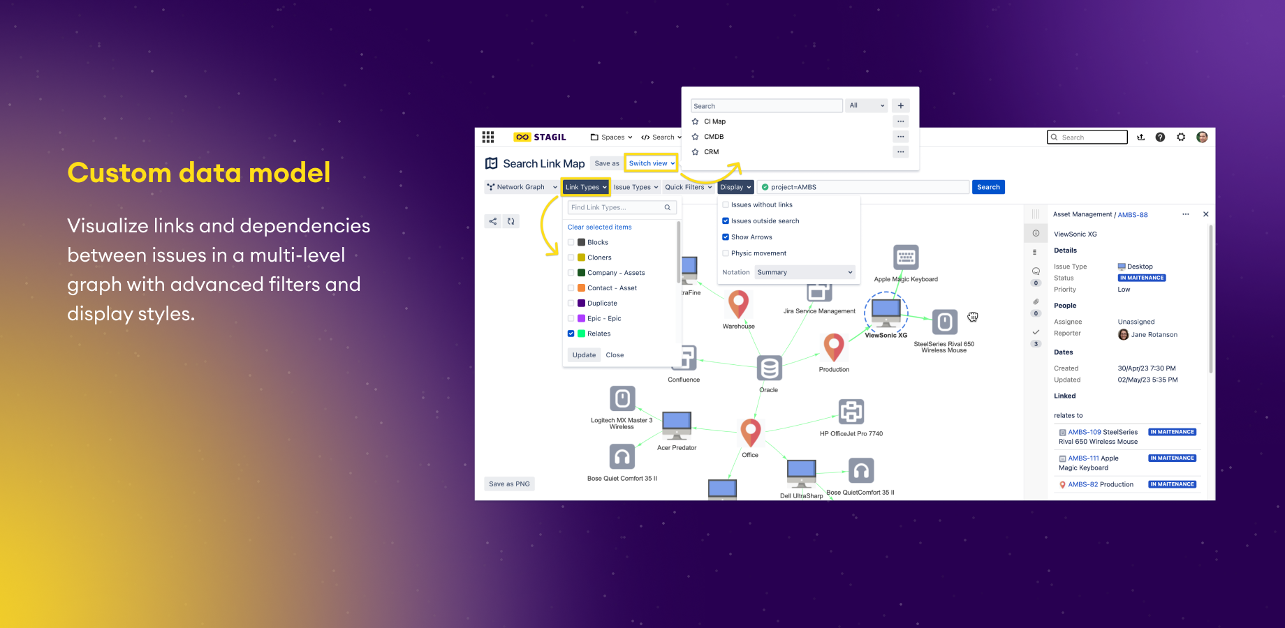 Key highlights of the appVisualize Jira work issue links and dependencies in interactive maps while exploring asset structures and project hierarchy graphs