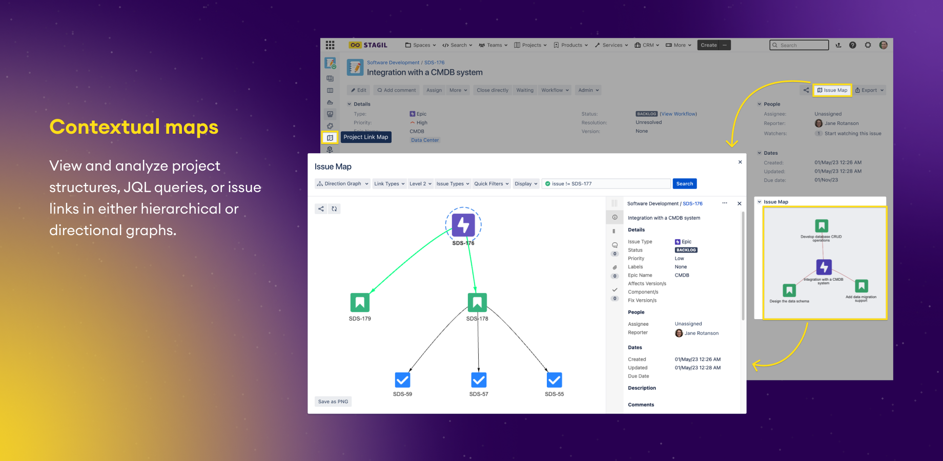 STAGIL Issue Maps helps you visualize issue relationships and project structures! With our app, you can easily create diagrams that show how issues are related and better understand your project's overall structure.