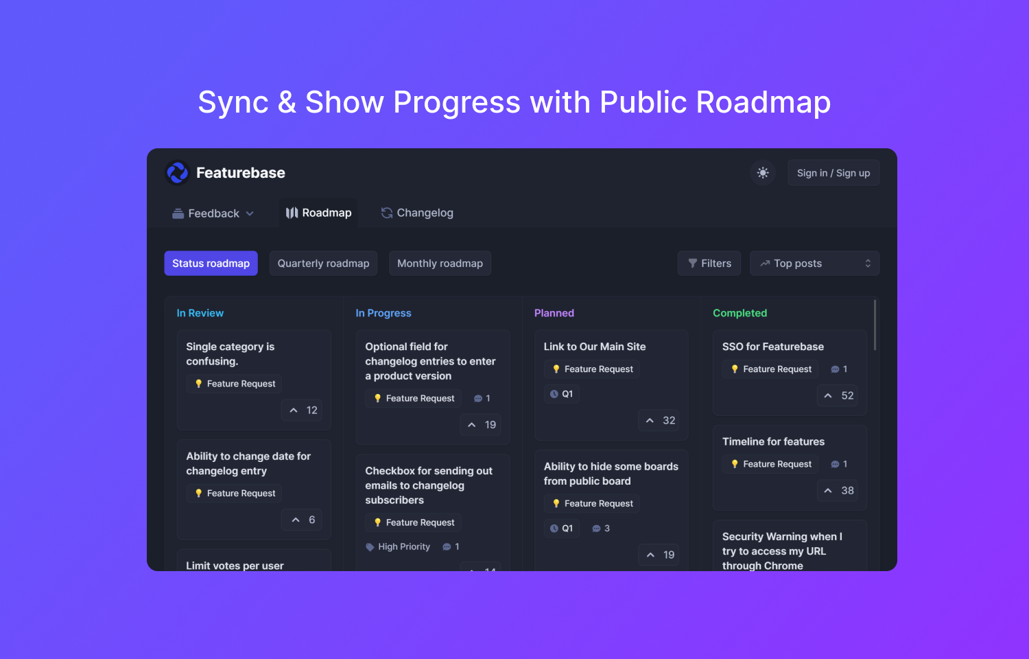 Sync Linear issues with user suggestions; share progress on your Public Roadmap.