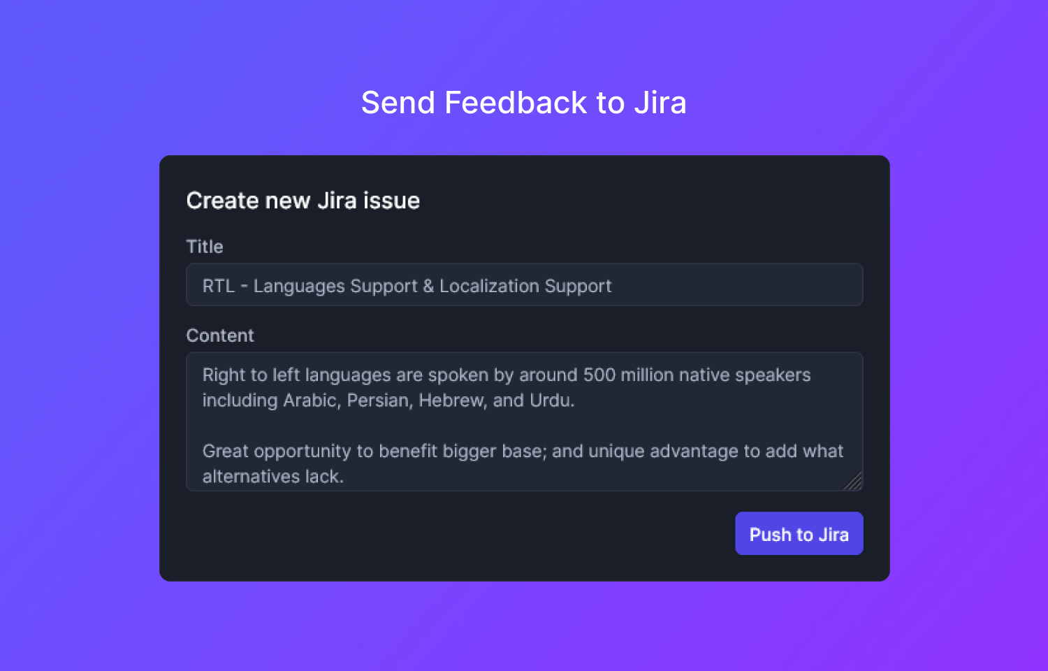 Featurebase helps you capture user feedback to get a better overview of your user's needs. Let people vote on features and have the feedback automatically appear in your Jira backlog. Manage the most impactful and upvoted ideas straight from Jira and have them automatically synced with Featurebase, letting everyone know the current progress.Easily hop between linked Featurebase posts and Jira issues. Check on the latest comments on your Featurebase post and clarify any questions directly with users. This way, you can easily make sure what you build aligns with your user's needs.If you happen to already have an issue in Jira, you can simply link a Featurebase post with it. Click the Jira button on a post, select 'Link to existing issue', and search for the relevant issue. The issue will be synced going forward.