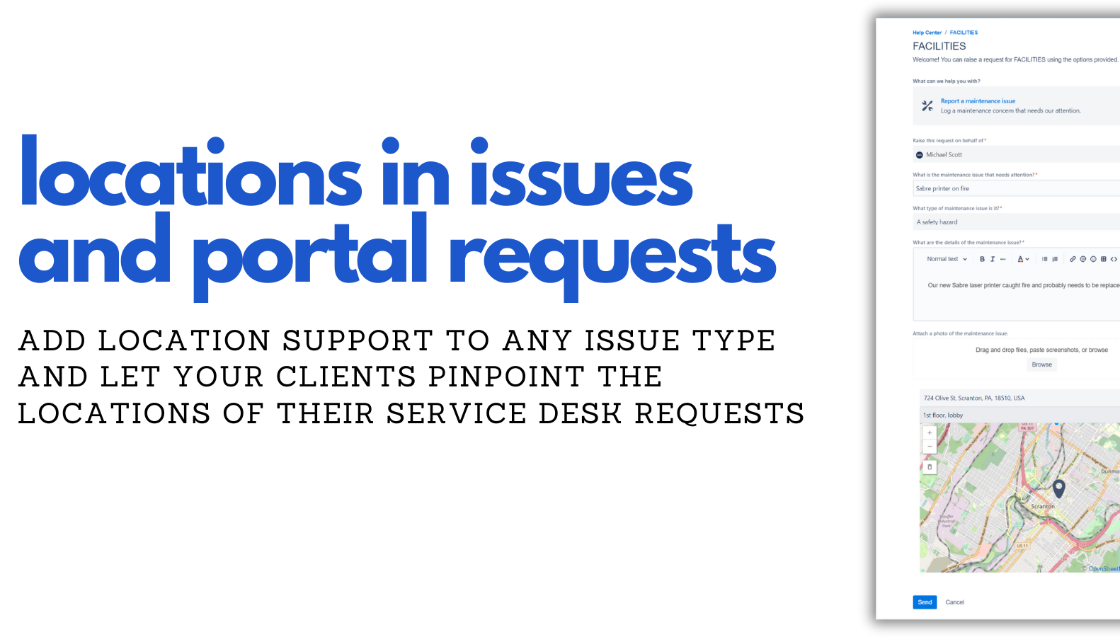 Add location support to any issue type and let your clients pinpoint the locations of their service desk requests.