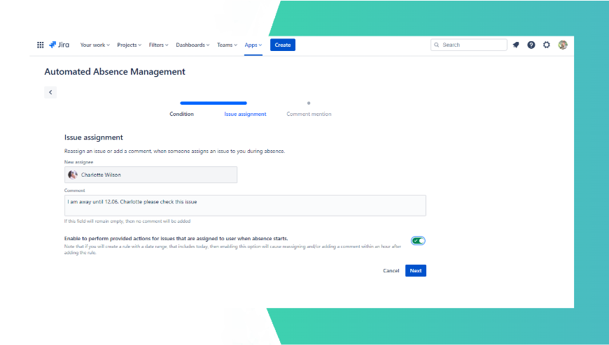 Someone assigns an issue to you during your absence? We will take care of it. Also, actions can be performed for the already assigned issues at the beginning of an absence. No issues will wait for you.