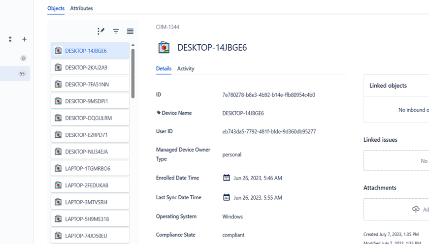 To ensure data consistency and maintain synchronization, the app offers automated asset updates. Any changes made in Intune, such as new devices, updates, or modifications, are automatically reflected in Jira Service Management, ensuring real-time data alignment between the two platforms.