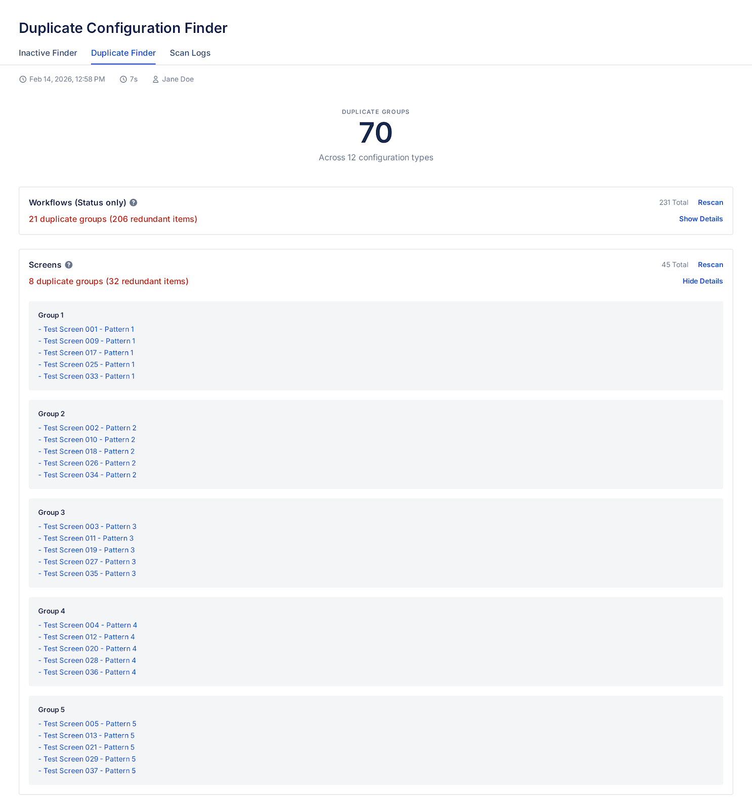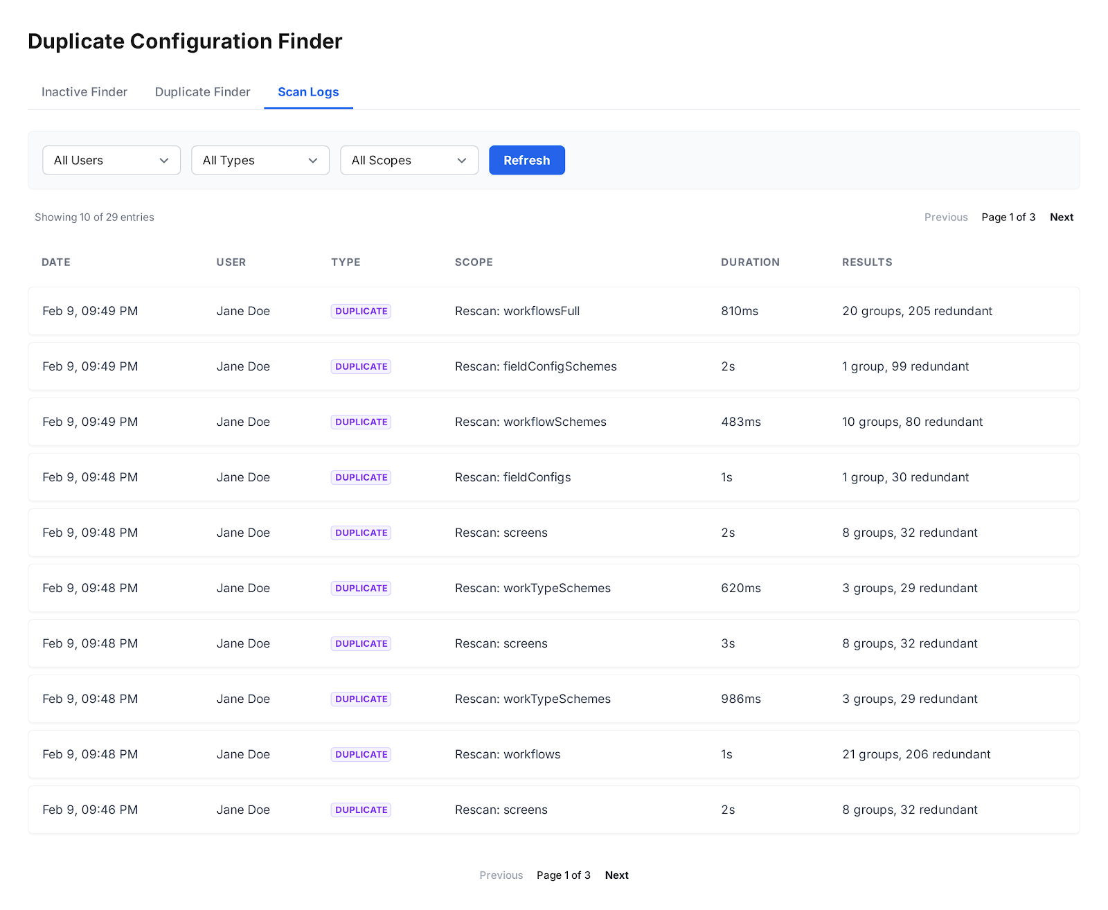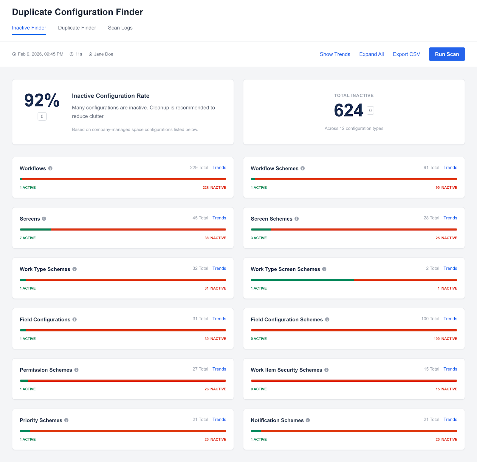 Duplicate Configuration Finder helps Jira Cloud administrators maintain healthy, high-performing instances by identifying duplicate and inactive configurations that clutter your system and slow down performance.