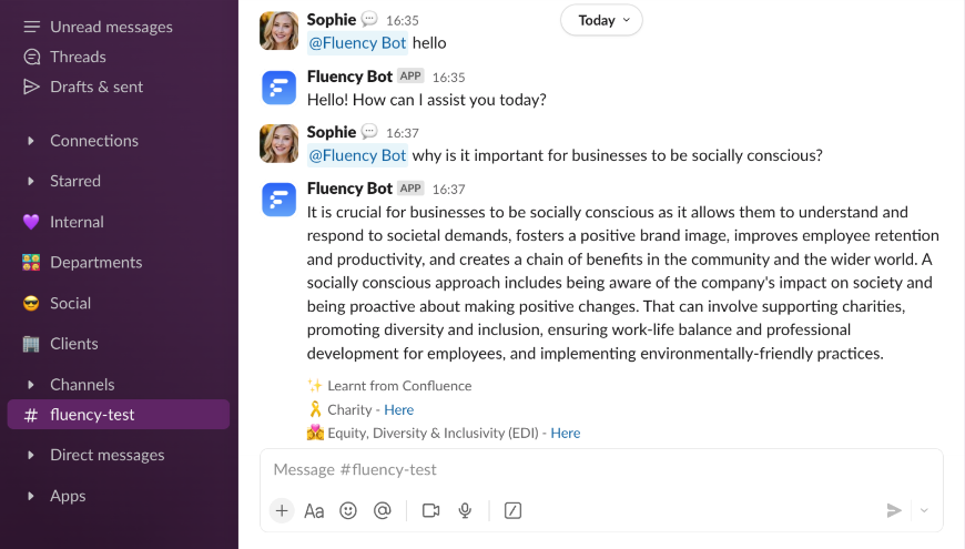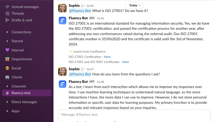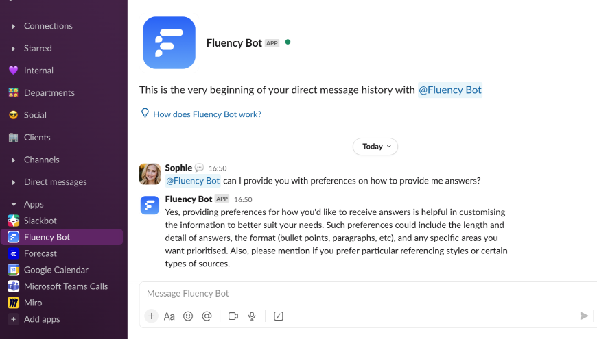 FluencyBot is primarily in English but supports questions in multiple languages. It’s ready for Slack and soon for Microsoft Teams too.
