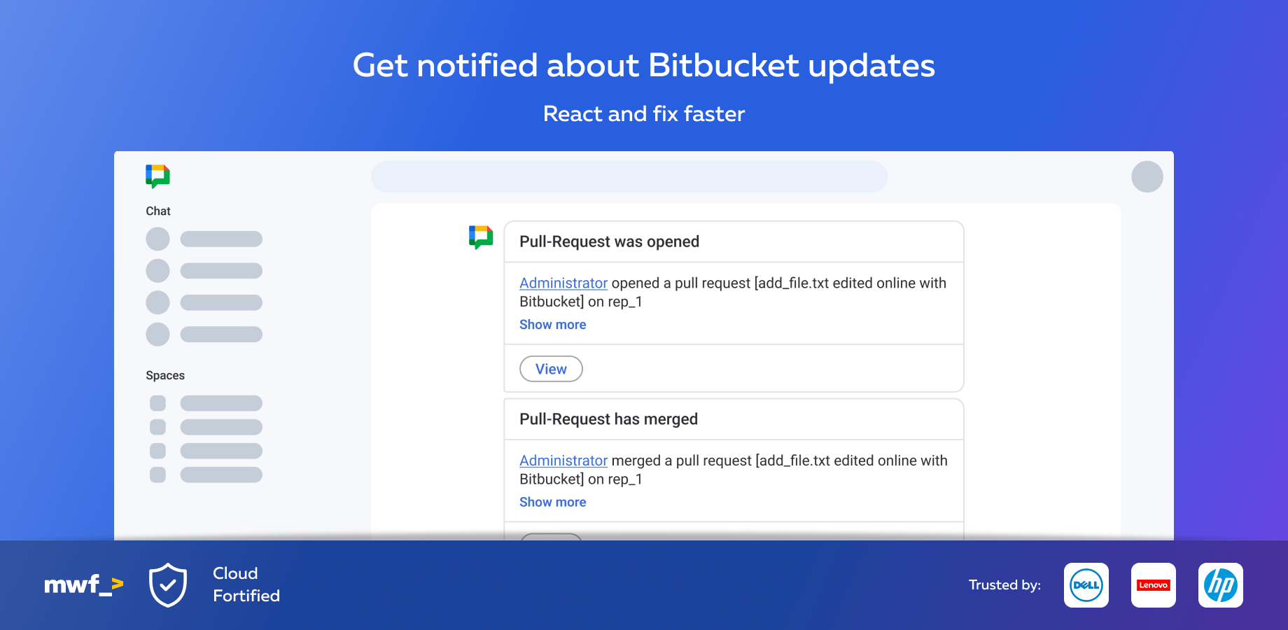 - Get notifications on your Bitbucket repository events directly in Google Chat.
