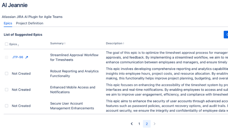 AI Jeannie generates Predictive Epics and User Stories using Generative AI, based on the configured project definition.