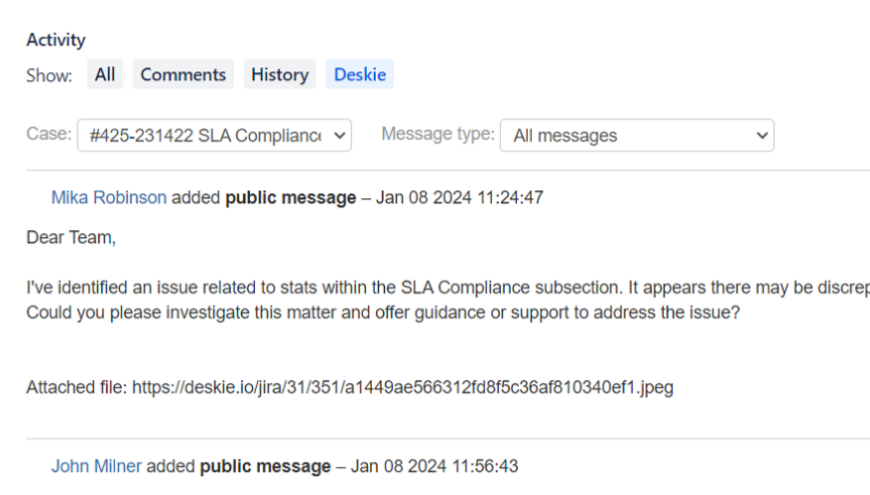 - Public comments and private notes of linked Deskie cases are displayed in the Deskie activity tab within Jira.