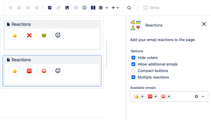 Reactions Macro for Confluence invites users to express their reactions through a simple yet powerful selection of emojis 🙌. Add specific emojis as voting options, allowing your audience to vote on ideas💡, articles📝, or topics ℹ️.