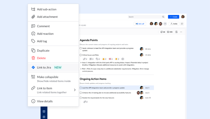 Send meeting actions from adam.ai to Jira and ensure updates are synced in both directions, guaranteeing that no essential task is overlooked.