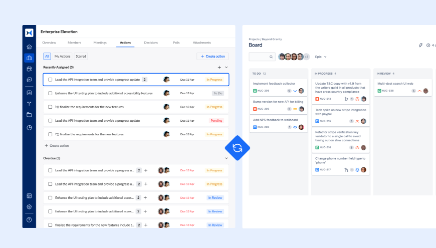 Efficiently track and follow up on actions across adam.ai and Jira, with synced updates between both systems, keeping projects on track and driving forward project progress.