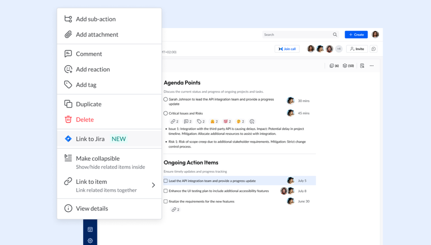 - Efficiently track actions from meetings in both adam.ai and Jira.