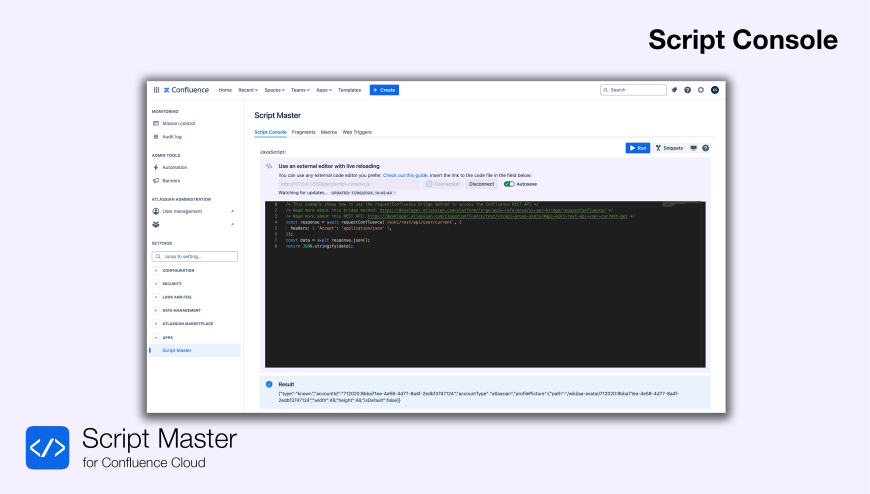 Create and run scripts directly in your Confluence to apply bulk updates, communicate with the REST API, and automate routine tasks. Forget third-party dependencies - only pure JavaScript and Forge Bridge APIs