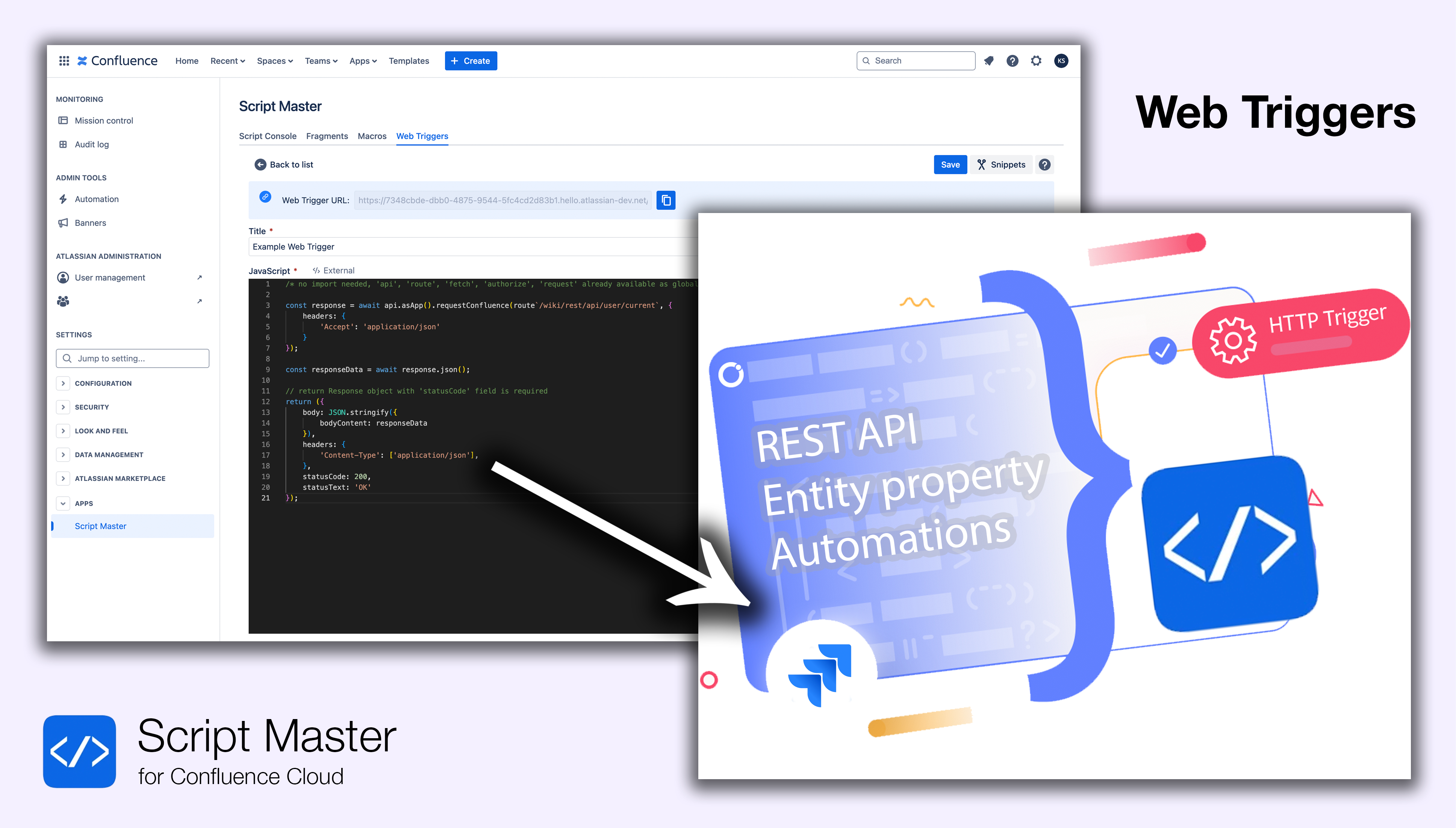 Scripted "Web Triggers" are JavaScript functions running on the Forge back-end that respond to HTTP requests. They enable seamless integration between your Confluence instance and external systems