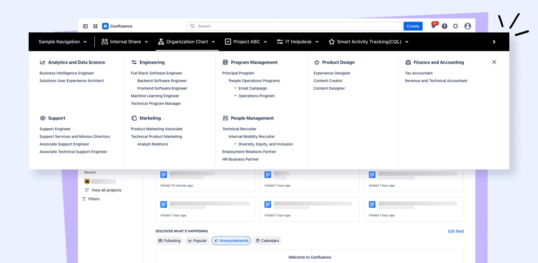 You can configure all spaces and pages in Confluence according to your organization's teams and business lines.