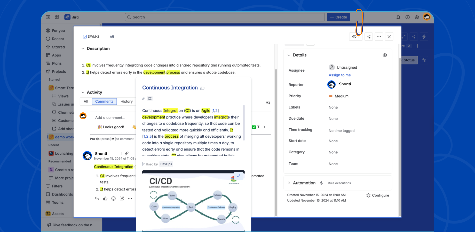 Smart Terms for Jira highlights key terms, acronyms, and definitions right in your Jira work items. Click on a highlighted term to view its definition, related terms, and even media content, all without leaving Jira.