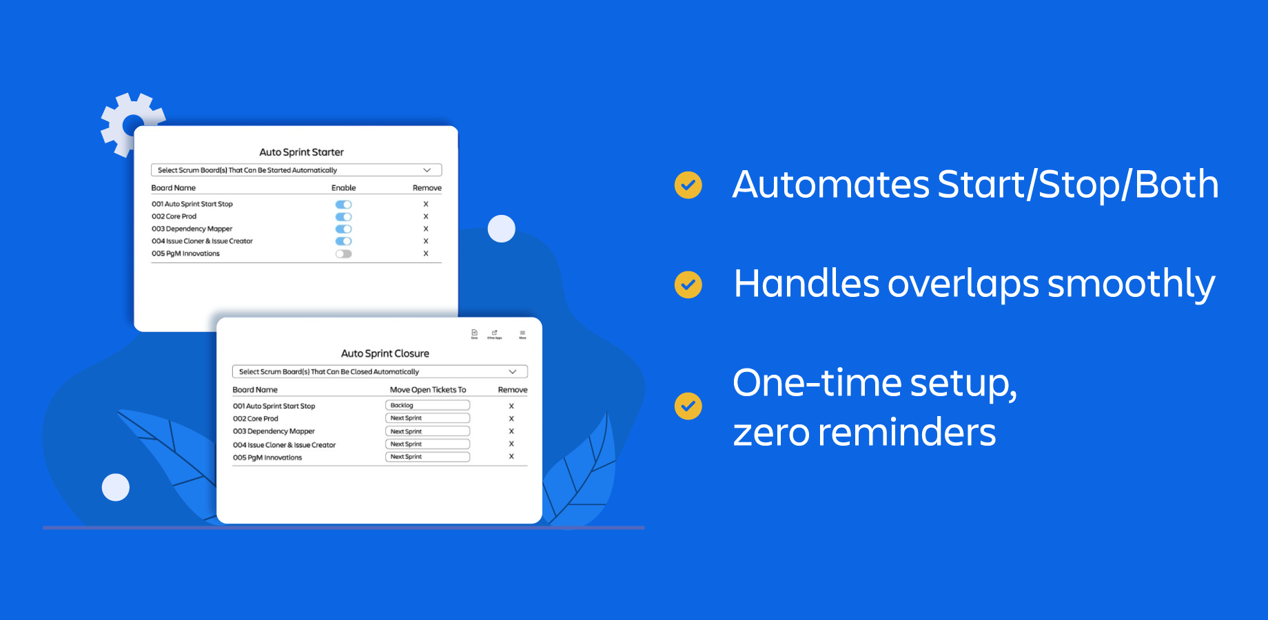 Built on Forge with org-friendly permissions, this app scales from one to hundreds of boards with consistent behavior and zero extra infrastructure. Automate sprint start, stop, or both per board.