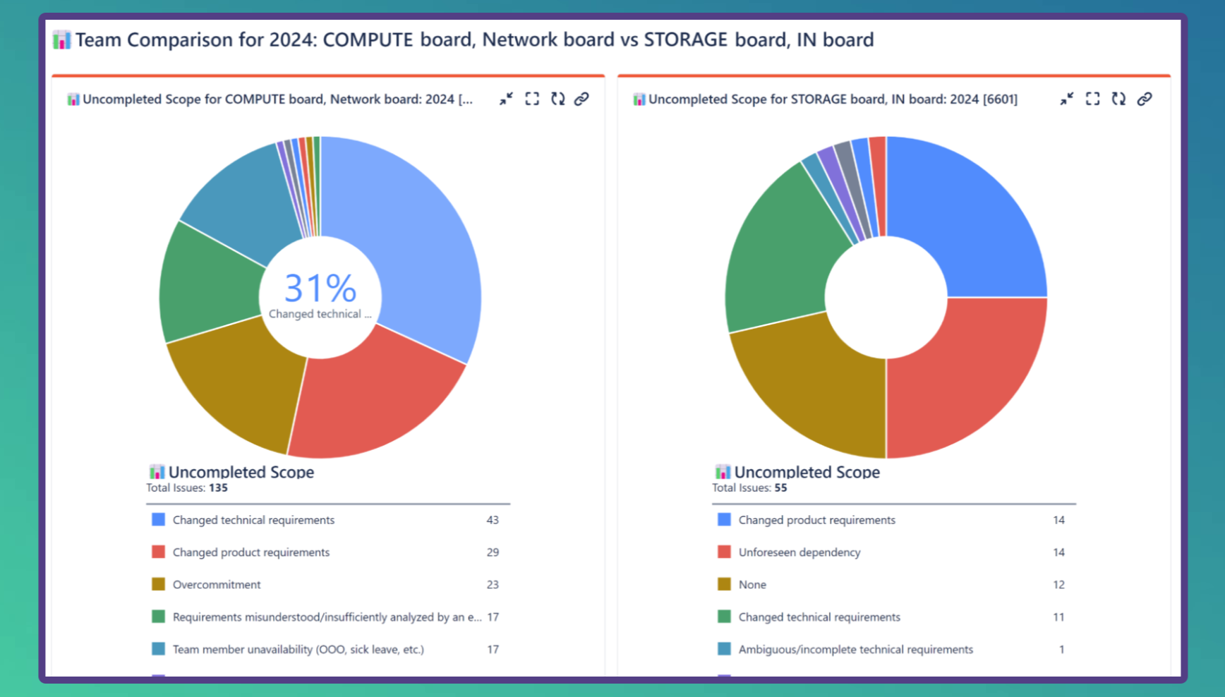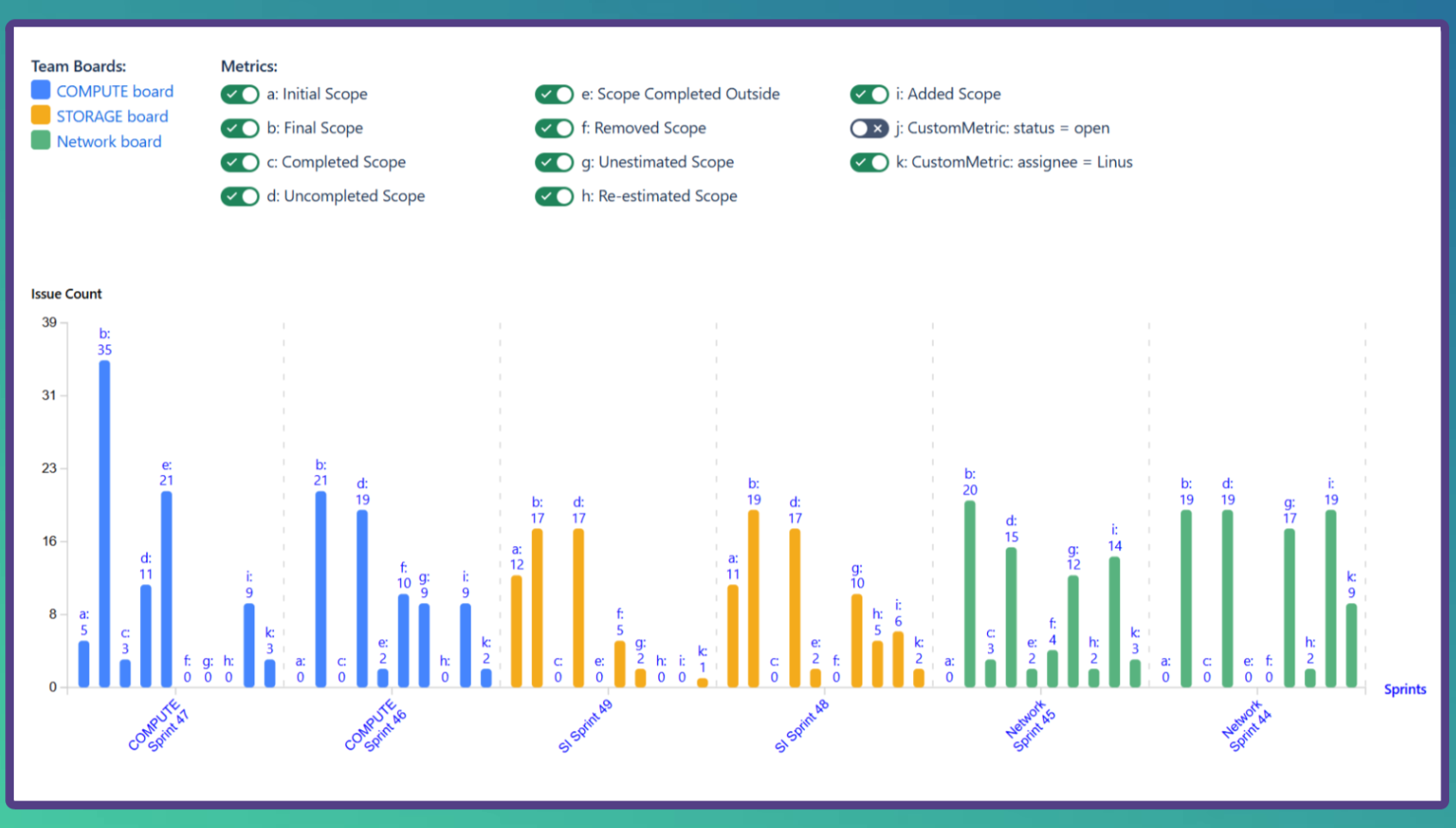 - Track 9 pre-built & custom JQL metrics over sprints/months/quarters/half-years/years for multiple teams