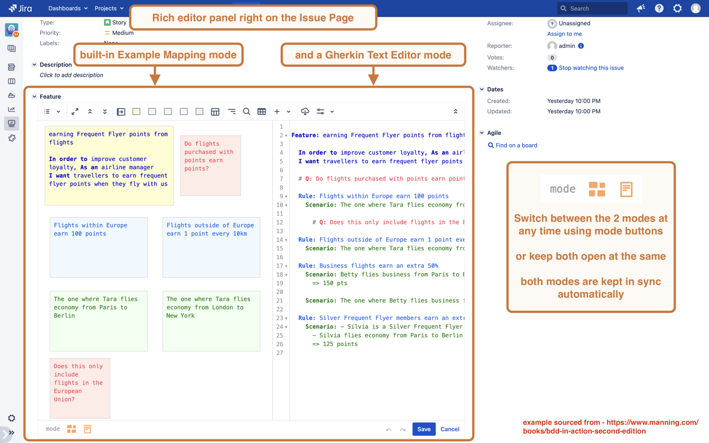 - Enables anyone on your team (PO, Scrum Master, Analyst, Tester, Developer) to guide and facilitate the adoption of BDD directly from Jira