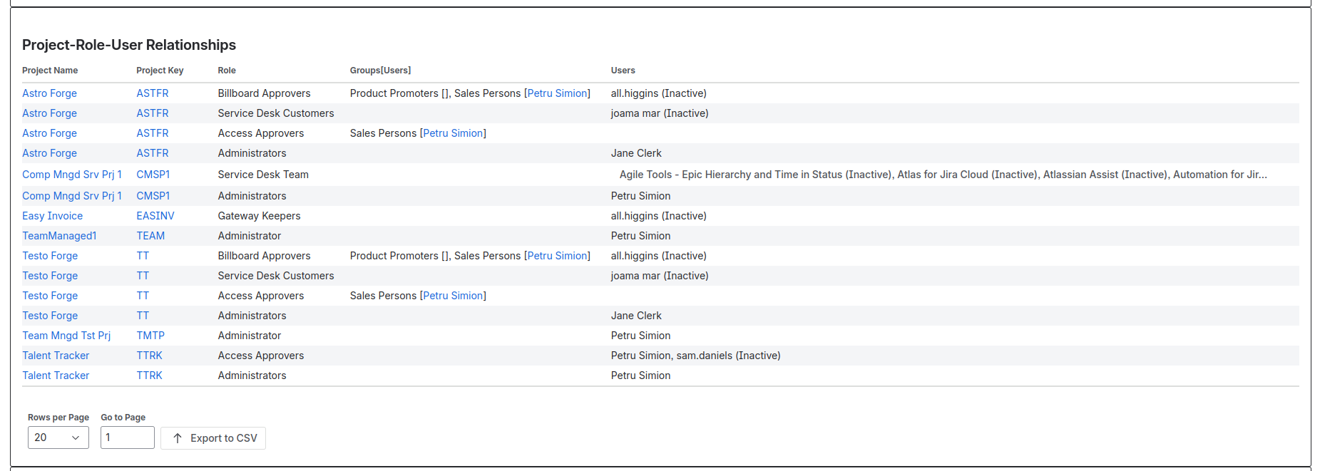 Get a complete picture of each user's roles and responsibilities across multiple projects. Easily identify user workloads and potential conflicts. Plus, export to CSV for further analysis and charting