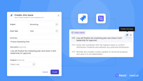 Use Read AI to record your meetings and automatically generate notes and action items. Then use Read AI for Jira to push your action items to Jira and keep track of them alongside all of your other issues.