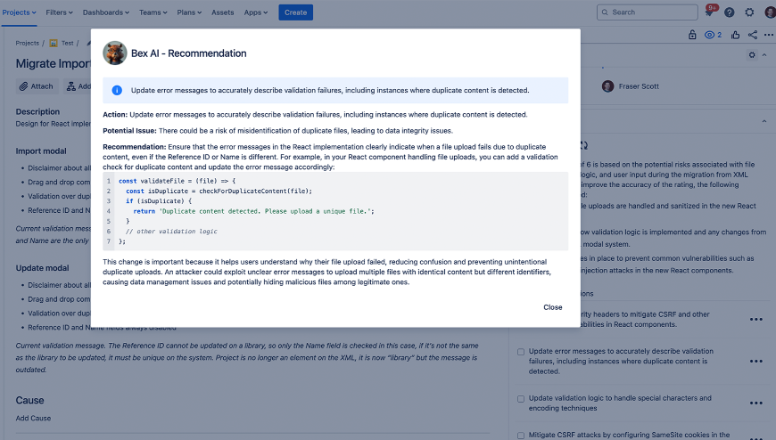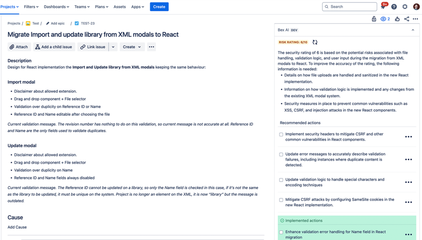 Initial release of Bex AI which includes the following features:* Create risk rating and summary for Jira tasks* Create recommended actions to improve security* Mark actions and implemented and not-applicable* Add recommended actions as comments to the Jira task* Tag the Bex AI user in comments to ask questions, get feedback etc.