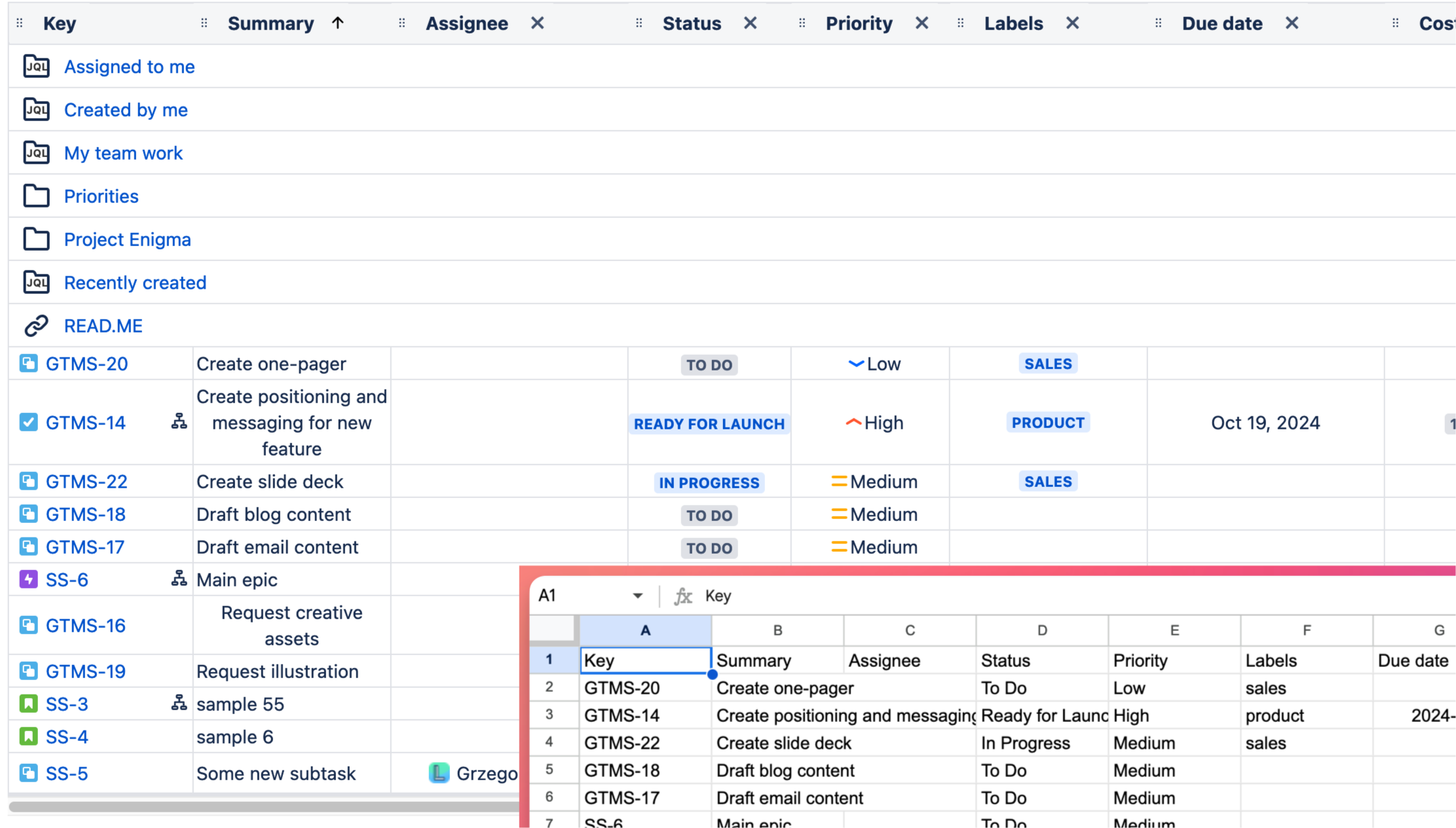 - Easily group Jira tasks into folders from any project to get a detailed view of a specific project, sprint, or workflow and track progress effective. Export all data from view to the CSV file for detailed reporting