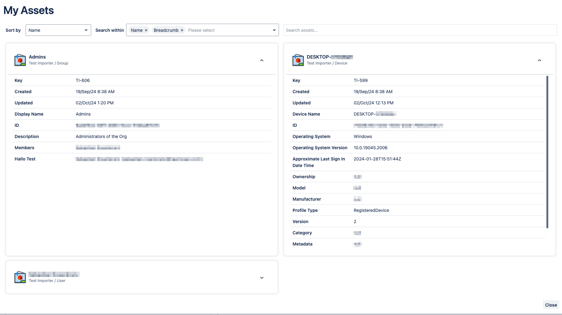 The 'My Assets' page acts like your personal asset inventory. It gathers and displays all the assets that are connected to your Atlassian user account. You can sort, filter and search with ease.