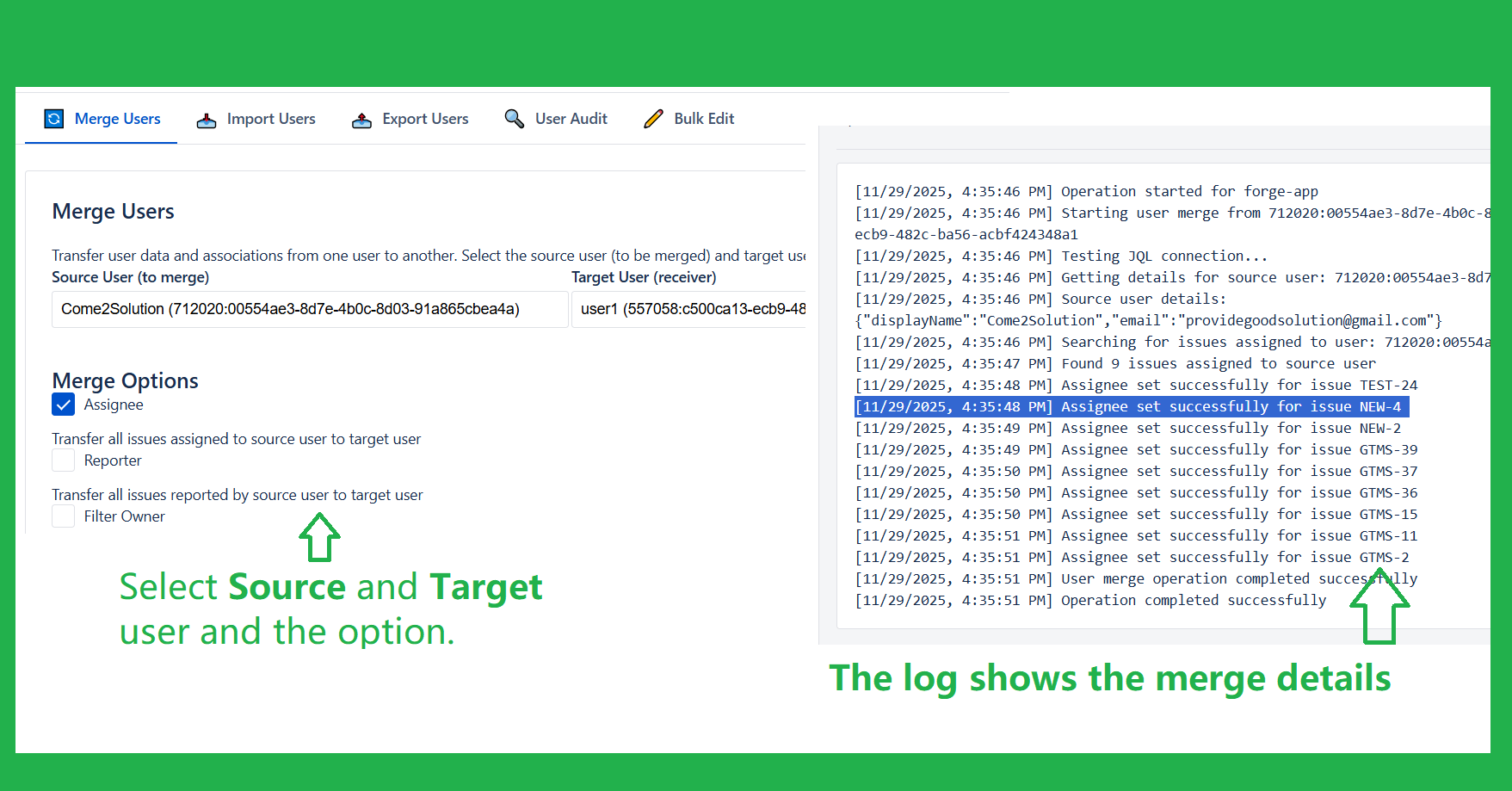 Merging Jira user accounts while preserving all critical relationships. Automatically transfer issues, permissions, filters, and custom field values from source to target users with one click