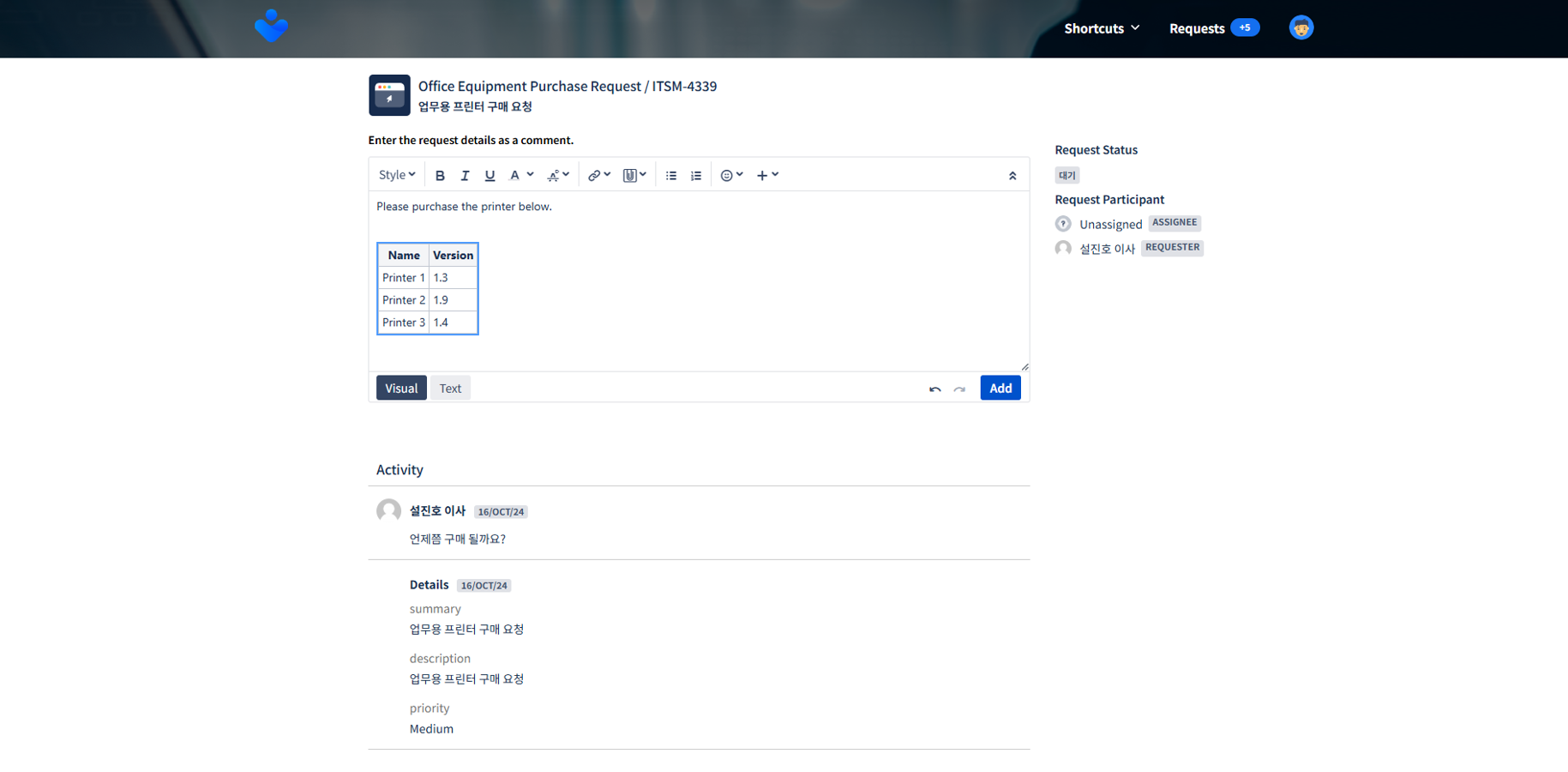 Clicking on a request opens a request form with a UI similar to Jira. - You can view requests and communicate through comments without navigating to Jira.