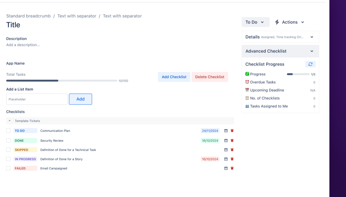 Advanced Checklist for Jira is a powerful task management tool designed to simplify and enhance your Jira workflows. With its seamless integration into Jira tickets, this Jira checklist app allows teams to create, assign, and manage detailed checklists without ever leaving their issues. Perfect for Agile teams, project managers, developers, and QA specialists, it ensures accountability and boosts productivity for any project.