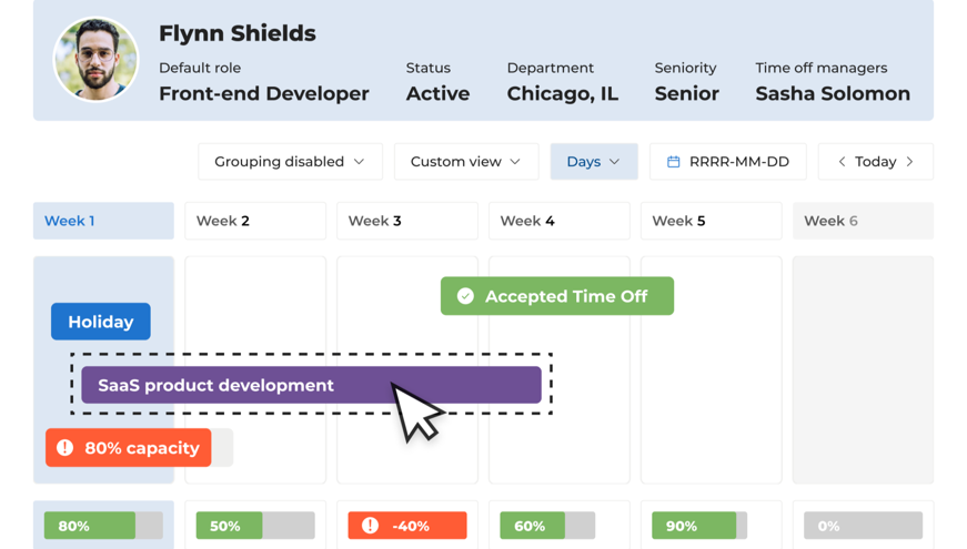 The availability heat map gives quick visibility into overutilization and bench threats while the conflict detector automatically warns about overutilization and schedule conflicts that can impact project quality.