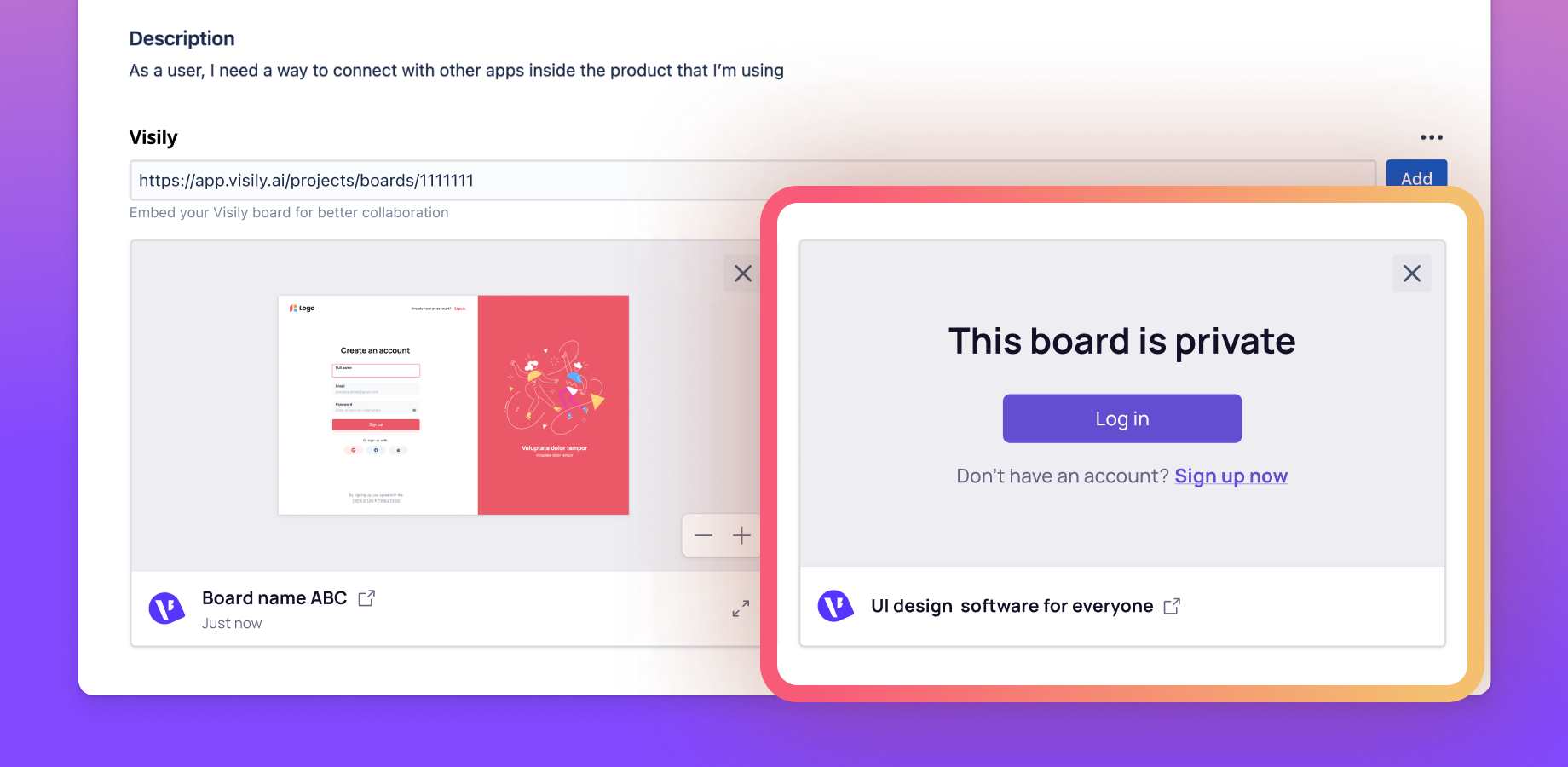Visily for Jira integrates Visily boards within Jira tickets, enhancing collaboration and design workflows. Embed up multiple links, interact with boards, zoom into elements, and manage private board permissions. The app ensures a smooth experience with full-screen mode and easy access to board links. For private boards, users are prompted to sign in and request access when needed.