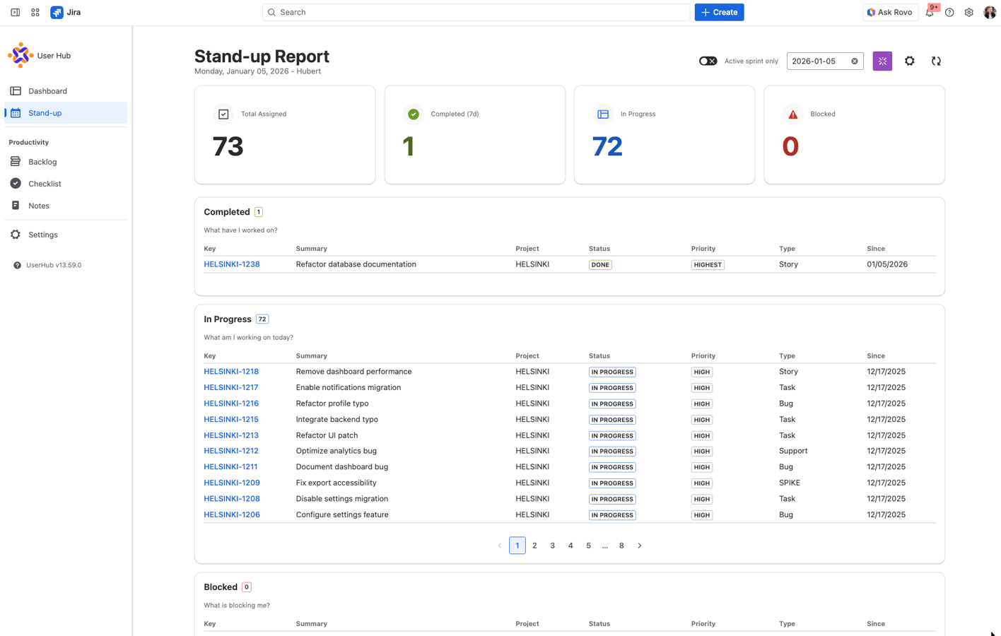 Manage your tasks efficiently with UserHub’s Personal Standup report—track Jira issues and answer to 3 fundamental questions: